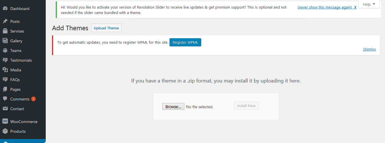 2. Click the Add New button at the top of the page then go for the Theme Upload option.