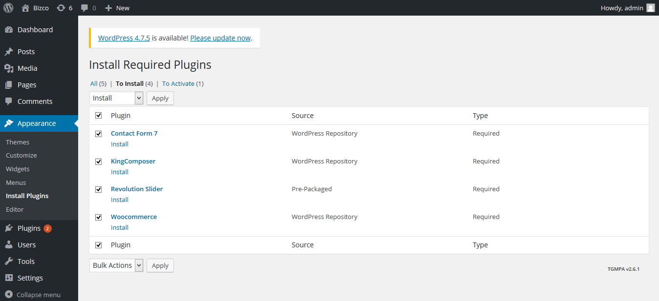 Right after the theme was activated, a notification at the top of the screen will suggest to continue with the installation of the plugins recommended for getting the best our of your theme.